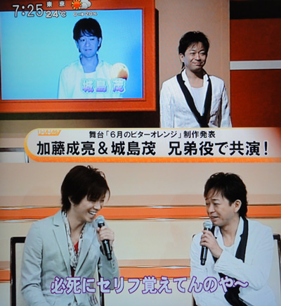 リーダーの舞台会見、長めにMXでやってくれました。ナンか、後ろのモニタにCMみたいのが流れてるんだけど、OAしてくれるのかな?会見でシゲさんのことを「TOKIOにはない、ストイックな感じ」って言ってるリーダーですが、シゲさんは「稽古が始まった瞬間にスイッチが入る。声が掛けづらいくらい、気迫がすごく役に入り込んで…」って緊張しながら、リーダーの印象について語ってると「必死にセリフ覚えてんのや~」と和ませてるのがサスガ。 名古屋だっけ?MCで舞台の話になった時に、舞台について尋ねられたリーダーがセリフが大変と言いつつ、どうなるか、自分でも楽しみって言ったのを聴いて、とっても感動したの。やっぱりリーダーはリーダーだ!って。そういうトコは智也と通じるね。肝が据わる感じ。手がプルプルしちゃうかも知れないけど、きっといい舞台になるんじゃないかと、段々楽しみになって来ました♪