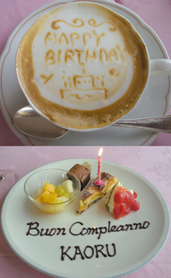 ランチは、六本木にお勤めの智フレさんチョイスのイタリアンレストラン。ビル最上階だったので、景色が綺麗でした。食べながらTwitter見てたら、ナンと、リーダーが急遽、本を手売りしてるっていうじゃない!サインはしてないけど、握手してるって!ナンだよー!だったら、その時に買えばヨカッタ…。ま、あのまま1時間は待てなかったからなぁ。でもでも、サプライズで、ちょっと早めの誕生日お祝いをしてもらっちゃいました♪全然知らなかったので、いきなりケーキ登場で驚いたよー!赤いケーキはスイカでした。そして驚いたのが、カプチーノ!絵を書いてあるのは見たことあるけど、こうやって「Happy Birthday」と入ったのは初めて!その他にも、葉っぱだったり、花火だったり、風鈴と「涼」って漢字が入っていたり、全員が違う柄で、またまたビックリ!凝ってるね~。更にお店の人が写真を撮ってくれて、ちゃんとカードにしてくれて、くれたんです。さすがだわ。