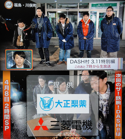 もう一度録画を見直してから、あらためて書こうかなと思ってますが、今日のDASHは思った以上に胸にきました。笑いつつ、何度も何度も涙をぬぐって、せっかく回復した頭痛がぶり返しそう。翔司会の番組内で途中で中継があると思ってたけど、その中継でのTOKIOと翔の温度差に笑っちゃった。もちろん、特別番組の司会という大役で、きっちりやらなきゃって思う気持ちも判るし、それが彼の正しい姿勢だと思うけど、レギュラー番組で、生放送とはいえ、後輩からのフリには、軽~く手を振って応えちゃう、さすがのTOKIO。…っていうか、太一だけだけどね。リーダーがカミカミだったのは、寒さのせいだと信じますが(川俣町は言いにくいよね!?)、やっぱりこの後の生放送が心配になったのは、言うまでもなく。本編エンディングで、智也が「モノマネやる!?モノマネやる!?」とノリノリで太一と2人、起き上がリーダーこぼしのマネしてるのが可愛いぞー!次回が4月8日っていうのが、ツラいなぁ…!