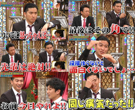 太一が料理を給仕する時、やっぱり、いろいろ喋ってるよね?今回は特に、いっぱい喋ってるように見えたんだけど。ナンか、文句言ってる?イジワル言ってる?マボが突っ伏したのはナンで?毎度のことながら、カットされてるトコ、多過ぎっ!メントレの時から、この文句言ってる気がする。「しやがれ」を見たから、余計に思うのかも知れないけど、あっちの5人組は先輩が出ても、TOKIOほど、上下関係を意識してないように思えた。世代の問題?ま、TOKIOの場合、こうする方が、面白いって、知ってるからか。