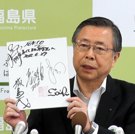 色紙には「ふくしまのみなさんへ」とのメッセージとともにメンバー5人のサインが記されている。色紙を手にした佐藤知事は本県農産物の風評被害払拭(ふっしょく)に全力を尽くす考えを強調した。
