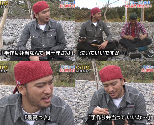 線路設置、気が遠くなるような作業だぁ。レールを運ぶのも、大変なのに、線路の固定の釘打ち。コレ、やっぱり人力じゃないとダメなんだよね?90㎝間隔で2つずつ。これも気が遠くなりそうな作業なのに、危険も伴ってるし。指叩いちゃって、痛さをグーッとこらえてる背中が痛々しい(ノ_・。)。「代わりましょうか?」と言われて「大丈夫です!」もう泣けます、ホント。その後のお弁当、ホントに嬉しそうな笑顔が見れてC=(^◇^ ; ホッ!お弁当を開ける時の指は、怪我してるようではなくて、更に(´▽`) ホッ♪達ちゃんは手作り弁当は自分で作るぐらいだから、冷静なリアクションだけど、智也一人テンションが高くて、それを見守る年長者2人の姿が、ほのぼの(^ー^* )♪1回のロケでどれくらい作業出来るのか判らないけど、あまり端折らないで、しっかりOAして欲しいな。みんなが頑張ってる姿、見せて欲しいです。そしてホントに怪我には気を付けて―!