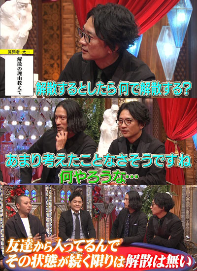 で、突然、「解散の理由」を尋ねる質問をぶっ込む太一。…ナンで、そんな質問を出したの?考え込む2人を観て、意外に思ったのかな、智也は。幼馴染とか、友達から始まる繋がりがある芸人さんって、結構いるみたいだなぁ。ダウンタウンもそうだしね。そういう人たちは、「解散」って言葉にはならないのかも。…この質問、今のTOKIOだったら、どうなるの?太一が前に「1人でも、(やる仕事が)納得出来ないと思ったら解散」って言ってたけど…。