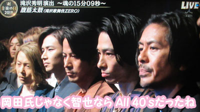 「音楽の日」の編集しながら観てて、胸が苦しくなっちゃって。VとかKinKiとか後輩Gが、中居くんに絡みながら歌ったり、出演グループ13組集合し、ジャニーさんの事を語る際に、中居くんは、ちゃんと出席してないGの事も言ってくれたけど、最年長として坂本リーダーがコメントしてるのを聴いて、今回、この番組にTOKIOが出てたら、どういう風にしたかなぁって考えて。あぁだこうだと、あることないこと、いろいろ書かれてる中、これだけ一体感ある空間にTOKIOがいない事が寂しくて哀しくて。この、心臓破りの坂をローラースケートで駆け上がるHiHiJetsを観てた諸先輩たち、一斉に湧き上がってたけど、ココにTOKIOがいたら、一番に盛り上がってたよね~。太鼓パフォーマンスが終わった後の歓声が一番デカいのが智也って、断言出来るわ。「ジャニーズイムズ」には、ファンをモヤモヤさせて待たせてるのを良しとする事はZettai無いよね。こういう想い、年末までには拭われるのかしら…。